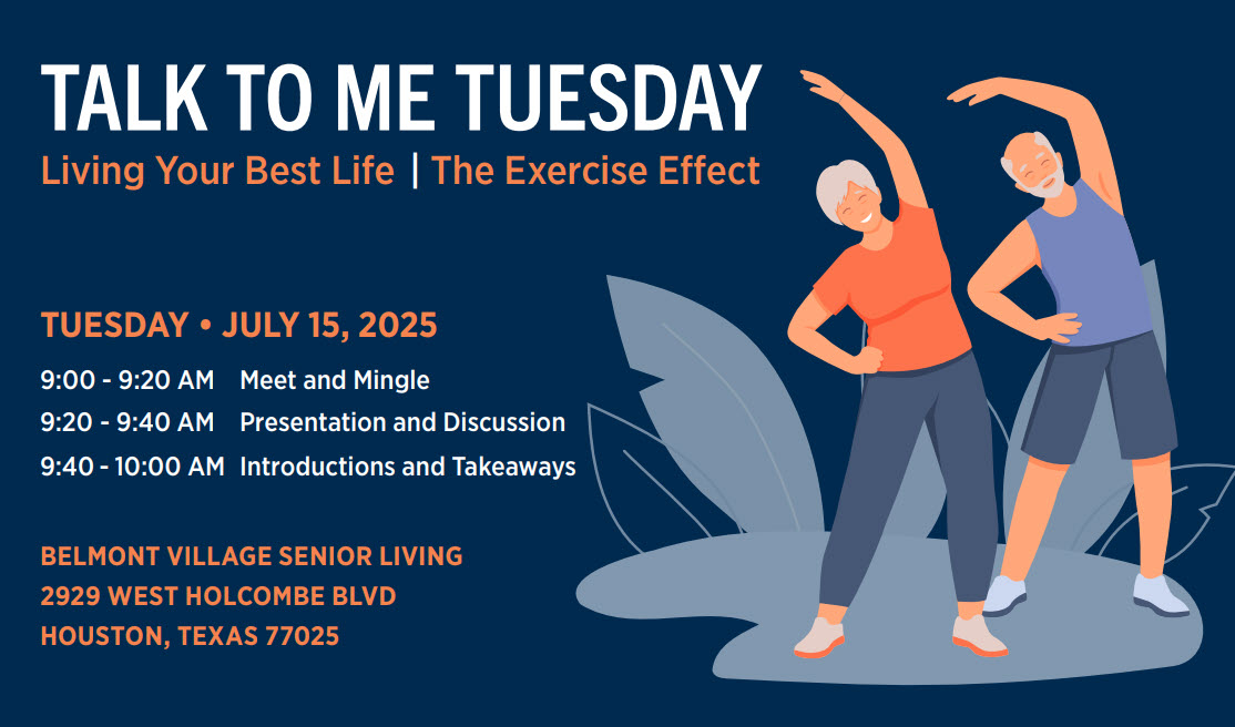 Tue Jul 15 Talk To Me Tuesday by Belmont Village 9:00 AM Speaker John Sisco with MedXFit Houston, RSVP Online at bit.ly/TalkToMeTuesdayWU0725 or contact KWard@belmontvillage.com or 346-241-2319