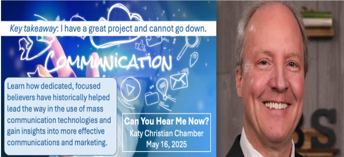 Fri May 16 Texas Christian Chamber Faith & Business Breakfast 7:00 AM Speaker Dr. K Lynn Lewis of The Bible Seminary, Â Grace Fellowship Church, 2655 S Mason Rd, Register at https://katychristianchamberofcommerce.growthzoneapp.com/ap/Events/Register/J5FdaM3cJCzC3